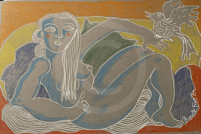 Dessin original, crayon de couleur et feutre blanc sur papier gris Clairfonfaine, 300g. 22x14 cm .